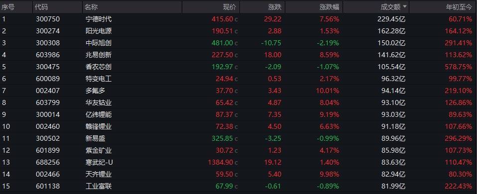 宁德时代成交额居首,为229.45元。其后是阳光电源、中际旭创、兆易创新、香农芯创,成交额分别为162.28亿元、150.02亿元、141.62亿元、105.54亿元。