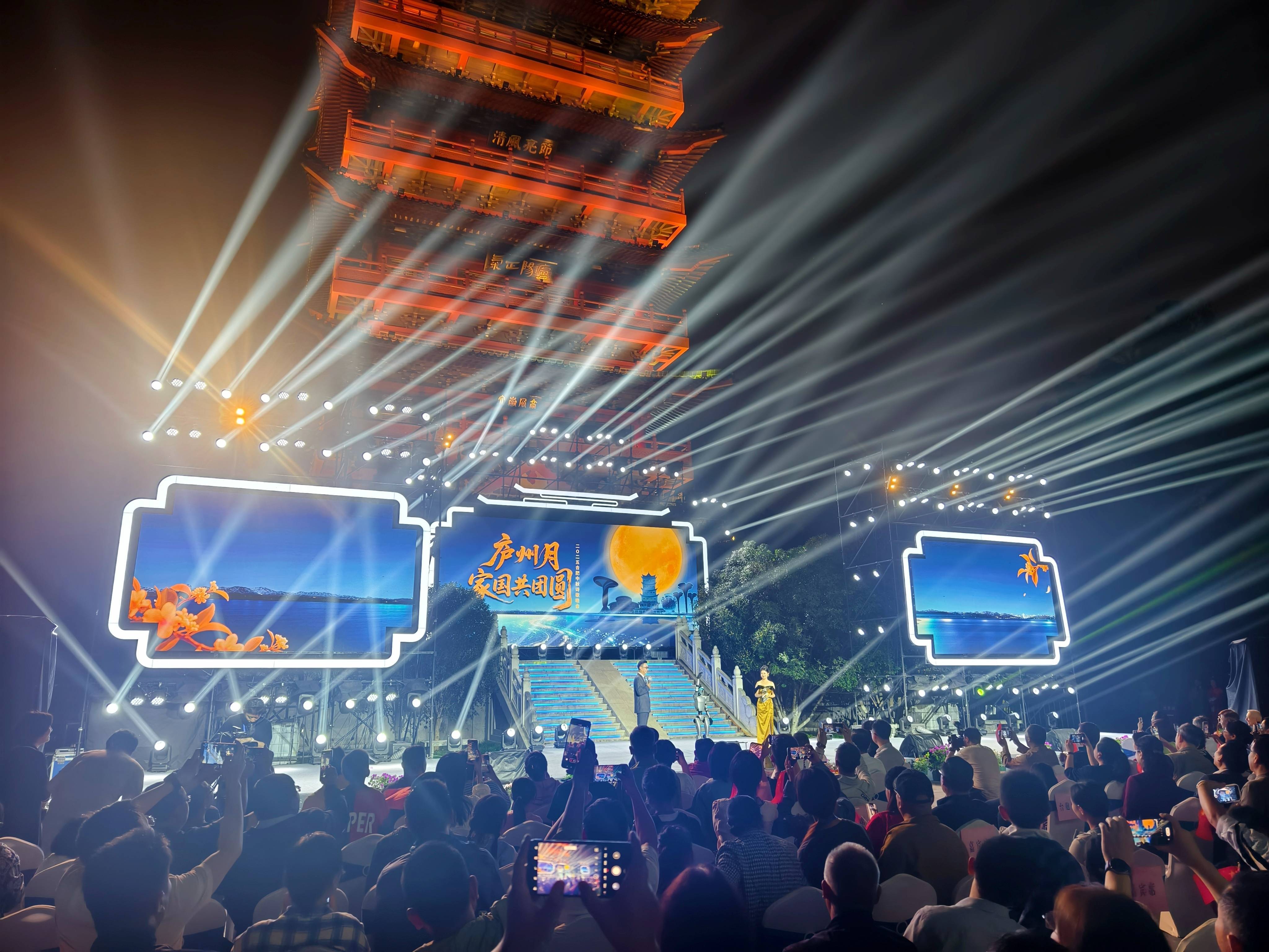 这是2025年9月29日晚在安徽省合肥市拍摄的“庐州月·家国共团圆”2025合肥中秋诗歌晚会现场。新华社记者 郭晨 摄秋日里,合肥包公园内,桂香正浓,游客如织。今年中秋夜前夕,“庐州月·家国共团圆”2025合肥中秋诗歌晚会在此举办,两岸青年通过视频连线隔空对话,以历史为桥、诗词为媒,促交流、盼团聚。